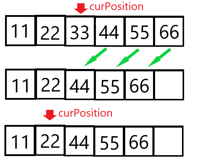 만약 값이 22인 데이터를 조회해 삭제한다고 한다면 다음과 같이 처음 값을 조회했다가, 그 다음 그 다음 값을 순차적으로 조사한다. 나였다면 단순히 arr[n]에서 n++ 과 같은 식으로 찾았을텐데, 별거 아니지만 참 많이 배운 부분이다.